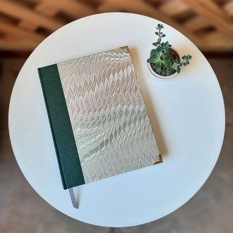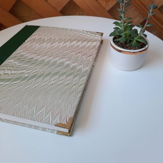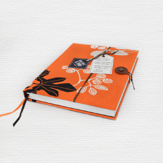 Cuaderno cosido y pegada a mano con materiales de calidad.