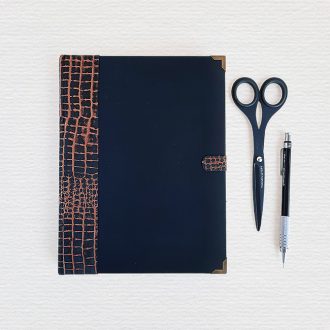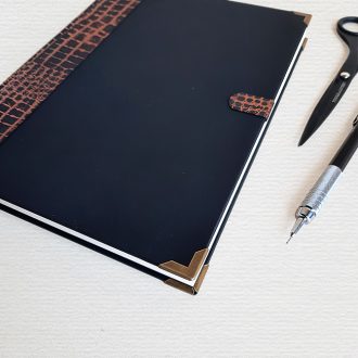 Cuaderno cosido y pegada a mano con materiales de calidad.