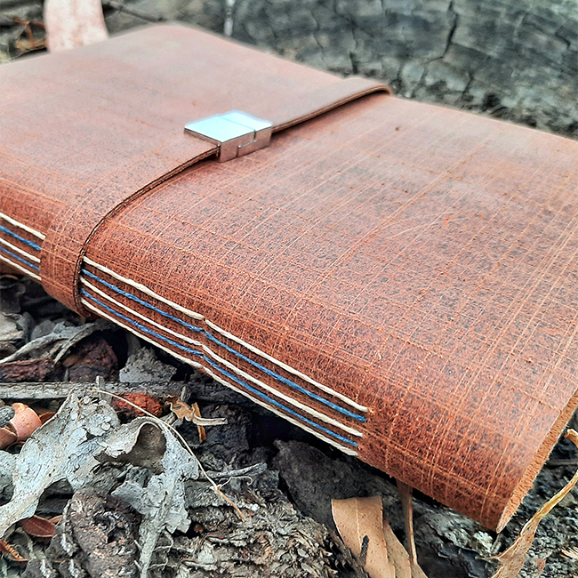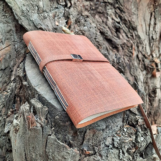 Cuaderno mediano cosido a mano con materiales de calidad.